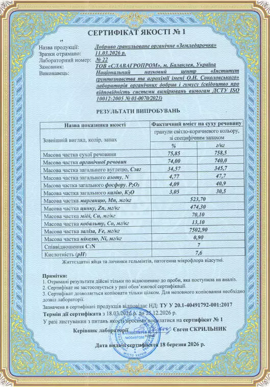 Гранульоване органічне добриво на основі курячого посліду з вмістом вуглецю, азоту, калію та фосфору.